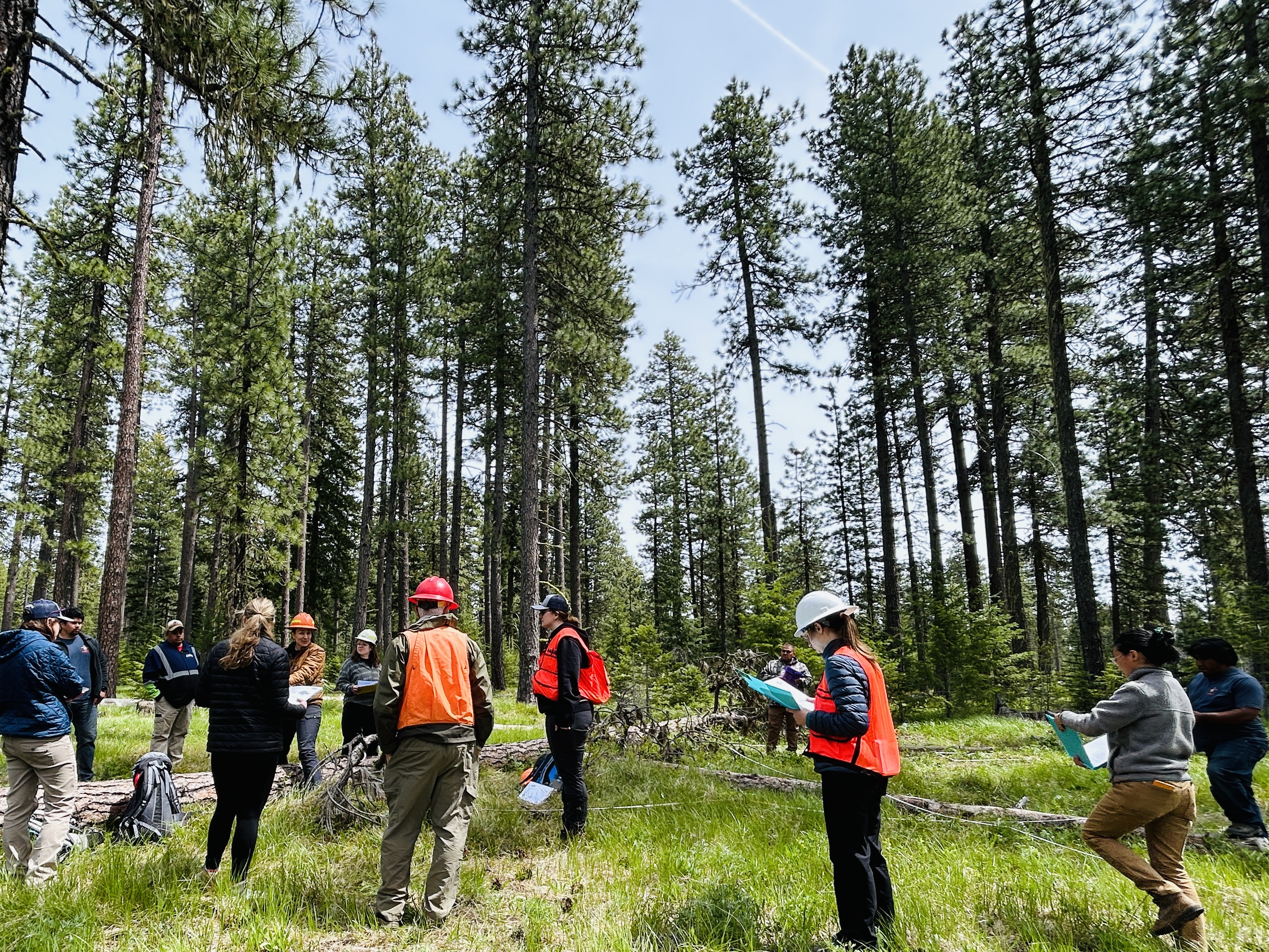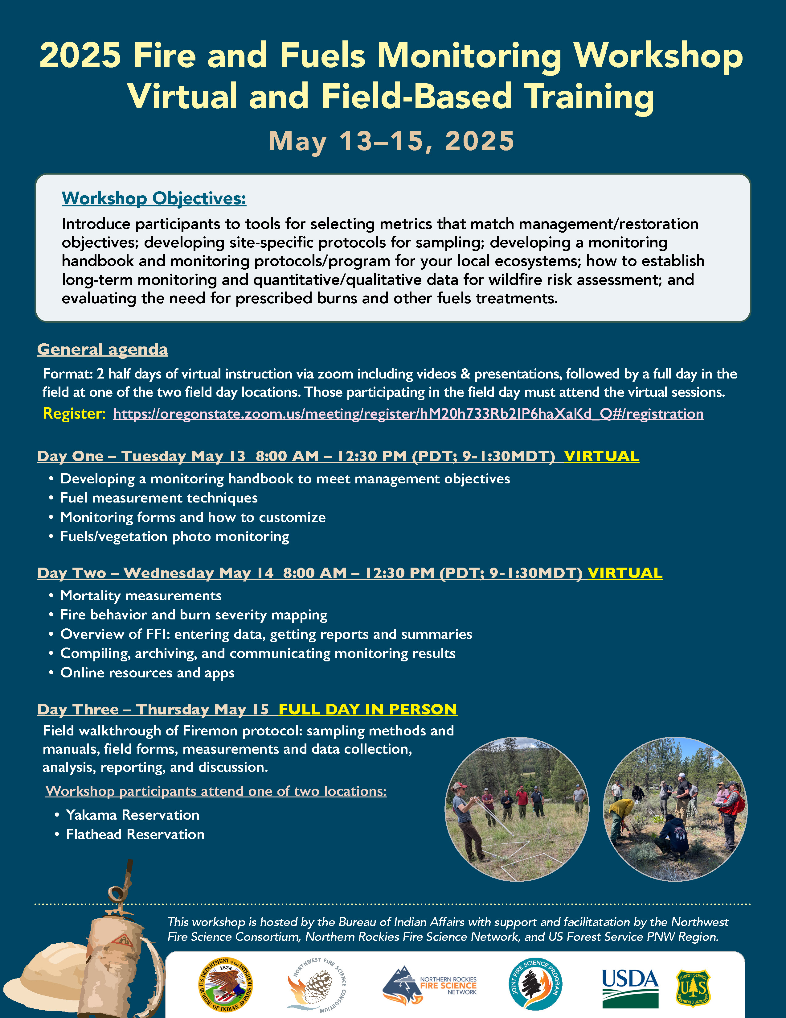 In 2023, the NW Bureau of Indian Affairs (BIA), US Forest Service (USFS) R6 Ecology Program, Northern Rockies Fire Science Network (NRFSN), and Northwest Fire Science Consortium (NWFSC), came together to implement a hybrid virtual/fieldbased monitoring workshop modeled after the excellent 2021 training that was developed by the Oak Woodlands & Forests Fire Consortium, the Lake States Fire Science Consortium, and the Huron-Manistee National Forests. Building off the recorded videos provided by the 2021 event, the 2023 workshop supplemented in additional live virtual and in-person training from local experts in the NW and Rocky Mountain Regions. Field days were hosted on the Warm Springs and the Spokane Reservations, with each focusing on specific questions that the Tribe and hosts wanted to address with their monitoring. This allowed participants to not only get an opportunity to practice baseline fire effects monitoring protocol, but also to modify standard protocols to the objectives and questions being asked by the host agency in their unique ecosystems.